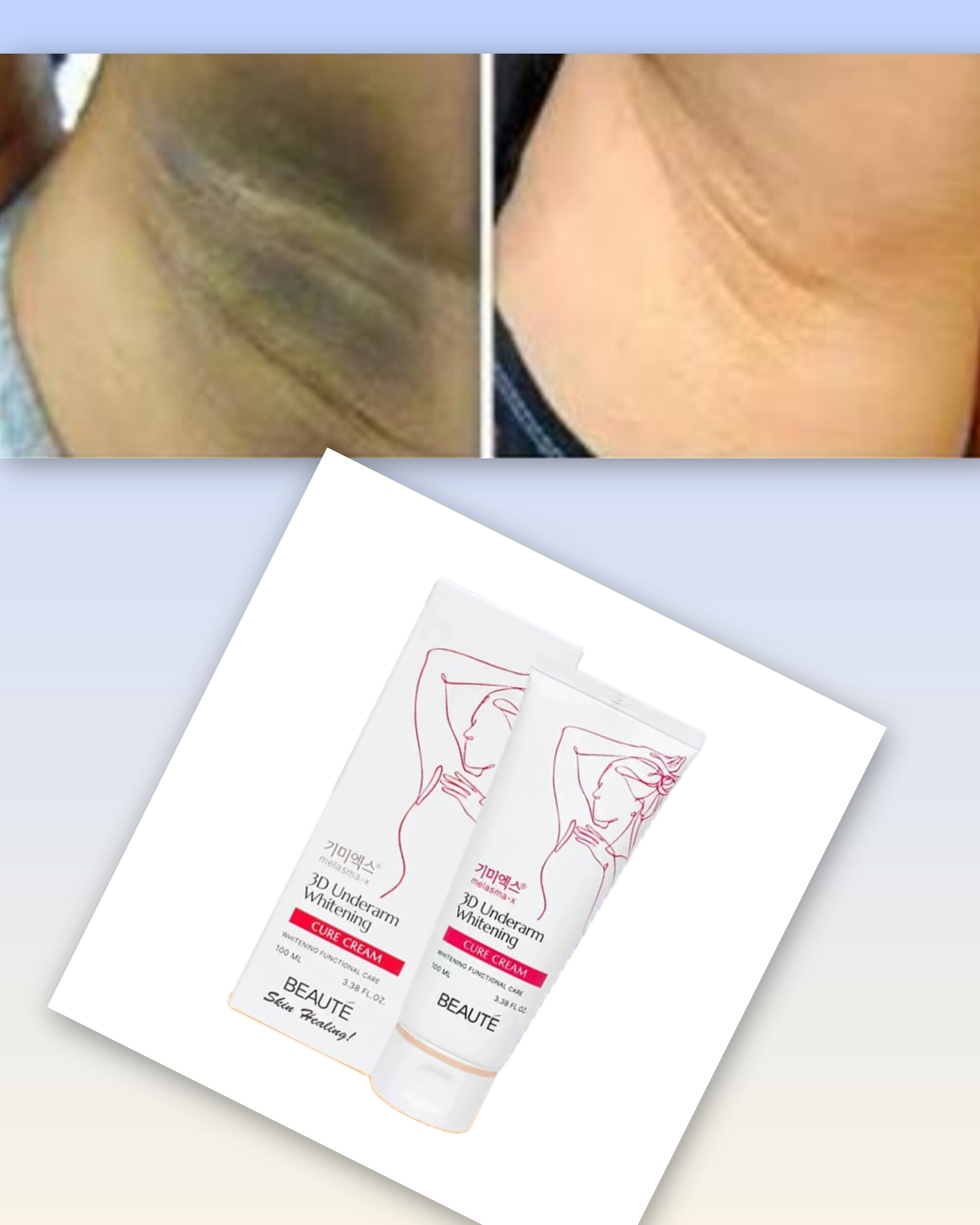 کرم روشنکننده زیر بغل بیوتی Melasma-X، حاوی گلوتاتیون و نیاسینامید، برای رفع تیرگی زیر بغل، کشاله و زانو، بدون ایجاد سوزش یا تحریک پوستی.Beaute 3D Underarm Whitening Cure Cream 100m l