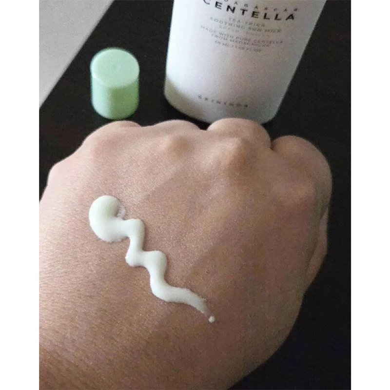 ضد آفتاب تسکین دهنده سنتلا TEA-TRICA Soothing Sun Milk یک ضد آفتاب شیمیایی با SPF 50+ PA++++ است که برای محافظت از پوست در برابر اشعه های مضر خورشید طراحی شده است. این محصول با ترکیبات تسکین دهنده مانند آب برگ درخت چای و عصاره سنتلا از ماداگاسکار غنی شده است که به کاهش تحریکات و قرمزی پوست کمک می کند.