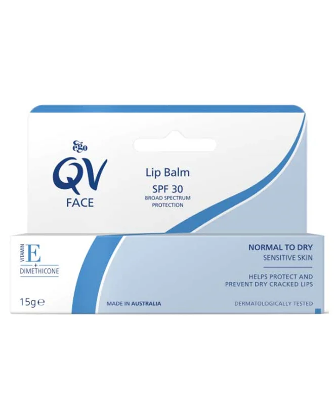 بالم لب کیووی SPF 30 وزن 15 گرم کشور سازنده استرالیا بالم مرطوب کننده لب QV با خاصیت رطوبت رسانی قوی می تواند به سرعت خشکی و ترک خوردگی را برطرف نماید. وجود ترکیبات ترمیم کننده در QV lip balm باعث بازسازی پوست لب می شود
